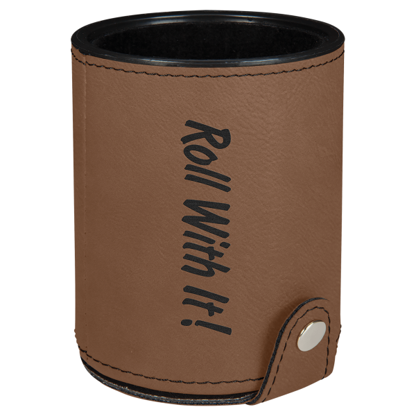 Let the games begin with this sturdy leatherette dice cup set! Leatherette is a man-made material that offers the beauty and durability of leather at a fraction of the cost. The cup features a velvet lining and a snap closure at the bottom where the 5 included dice can be stored. A perfect size to take along or for game nights at home, it’s available in several colors that can be personalized by laser engraving to a bold contrast. Also great for UV print!