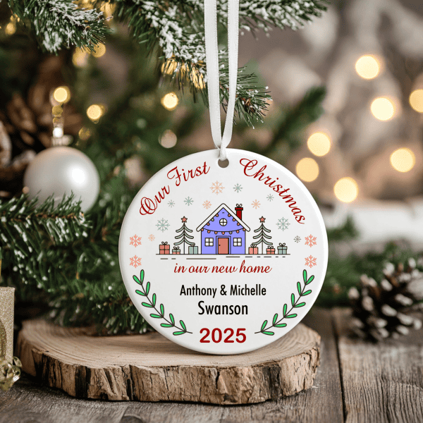 Personalized First Christmas in Our New Home ornament to celebrate the milestone of Christmas in your new house.