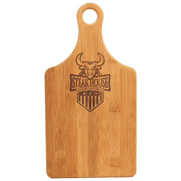Beautifully crafted 13 1/2″ x 7″ paddle shaped bamboo cutting board with handle. Can be laser engraved for personalization.