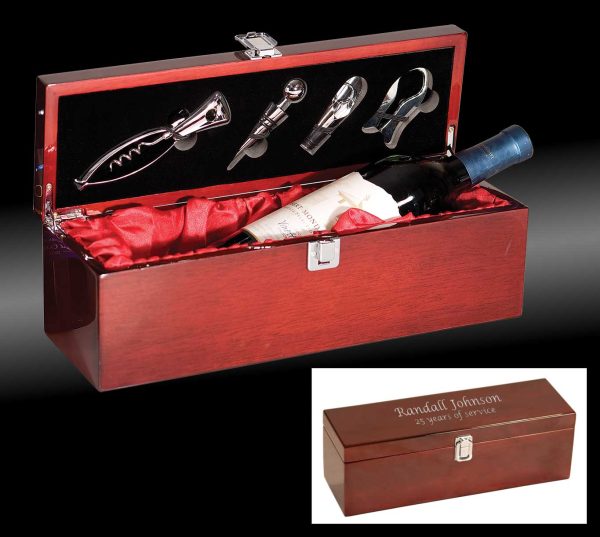 Beautiful wine presentation box. Holds one bottle of wine and includes 4 wine tools.